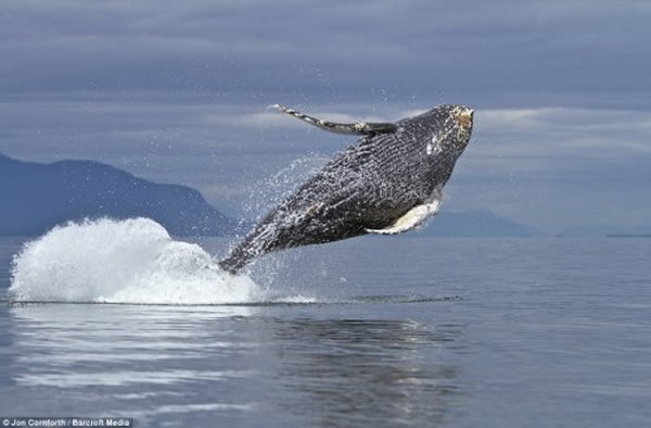 据摄影师介绍,在远离人类的太平洋东北角,他见到了这些“欢快”的座头鲸纷纷跃出水面。他说,一旦有一只鲸腾空跳出水面,它的同类便会一一效仿,仿佛在说“我也很快乐”。摄影师还补充道,“跃出水面进入空中,是它们互相表达喜悦心情的一种方式”。