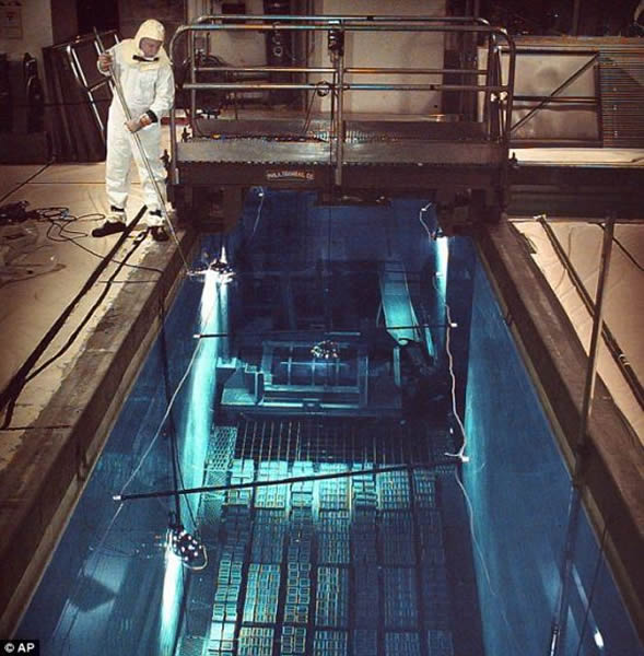 一名布鲁克海文国家实验室工作人员正在一个6.8万加仑的水池上工作。在回收处理前,这些来自反应堆的乏燃料棒被储存起来。