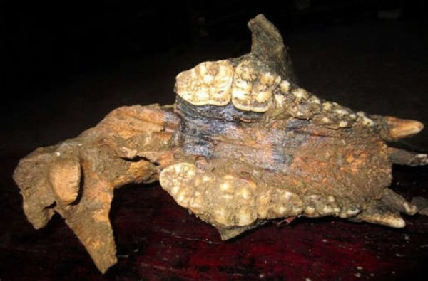 谭代江此次除发现这个大熊猫头骨外,还从另外一个叫龙骨洞的竖洞内,发现了一具头顶长尖角的奇特动物头骨埋在阴河边。