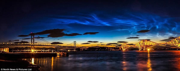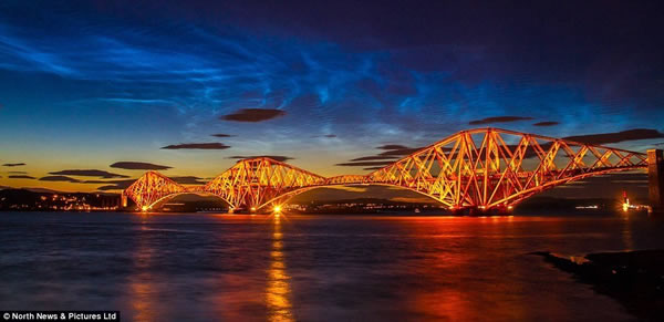 通常情况下夜光云是无法看到的,但在日落之时高空云层中的冰晶体将被照亮。夜光云在爱丁堡夏季大气层顶部犹为明亮,在经过一个星期的暴风雨之后,天空变得格外晴朗,一位摄影师拍摄到第四铁路桥上空出现的这一奇特夜光云。
