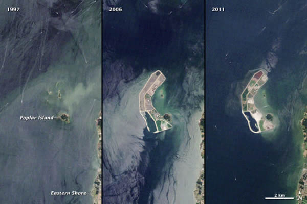 如果不是因为大规模的修复工程,波普拉岛应该在十年前就已经消失。1800年,波普拉岛面积超过1000英亩,岛上有一个约100居民的小镇。但到了20世纪90年代,波普拉岛却几乎消失了,面积只剩下10英亩。第一幅照片是美国陆地卫星5号(Landsat 5)于1997年6月28日拍下的,这幅照片显示,波普拉岛已经变成一个被海水包围的小绿点。