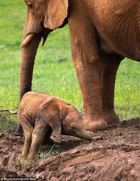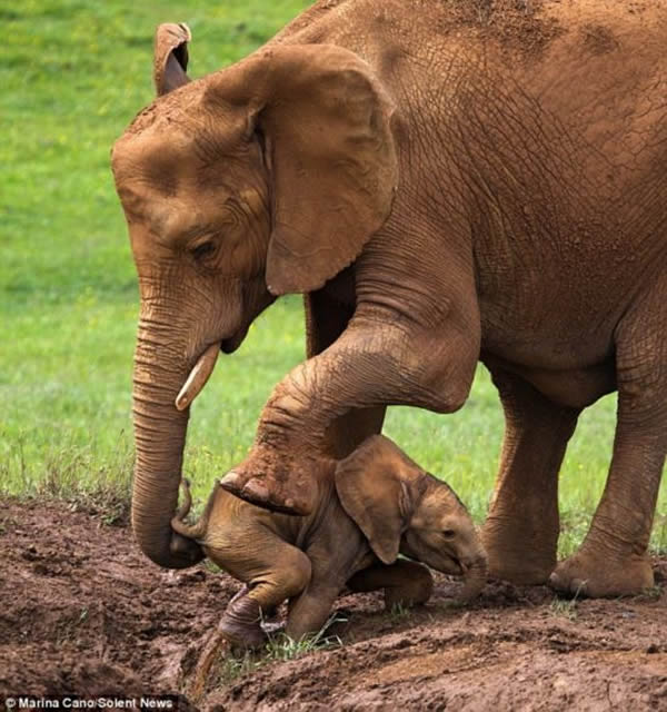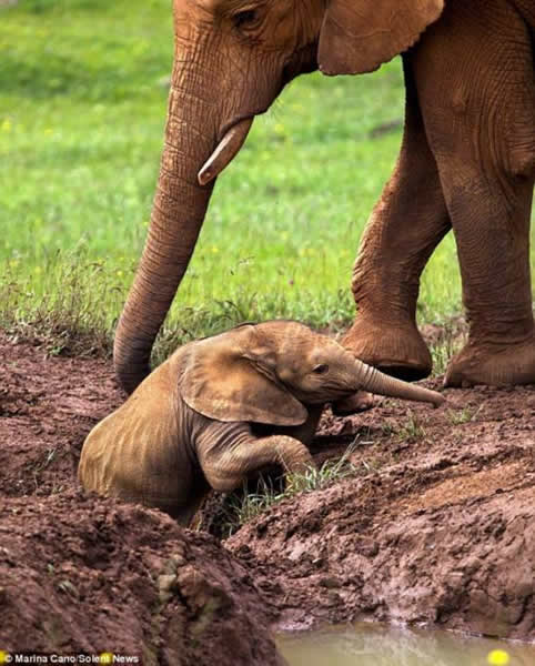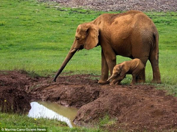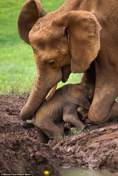 西班牙坎塔夫里亚的Cabarceno野生动物园里日前发生一幕动物亲子间的温情场景。一头小象跟随母亲趟过一个小泥潭时,不幸陷入泥沼,无法自己解脱。幸好,爱子心切的母亲回过头,前腿蹲伏,用巨大强健的长鼻子帮助小象走出泥潭。正好拍到该场景的当地摄影师Marina Cano说,他很有幸能看到大象母亲如此关怀幼崽,温馨的场面十分感人。