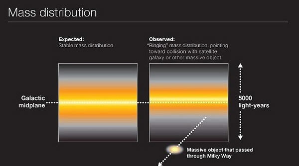 我们的银河系目前仍然受到这场怪异的宇宙碰撞事件影响,来自加拿大和美国的天文学家小组发现这场遭遇导致的结果如同“冒烟的枪”,其发生的位置靠近太阳系所在的银河系旋臂位置,至少在宇宙学意义上,我们可以认为这场碰撞是在近期发生,离我们并不遥远。根据加拿大皇后大学的教授拉里·韦德若(Larry Widrow)介绍:“我们发现了在一亿年前发生的神秘碰撞证据,当时银河系遇到了一个矮星系或者是一个存在大量暗物质结构的天体,碰撞产生的证据我们已经有所掌握。”