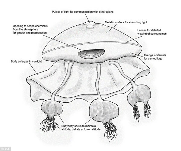 提及这种想象外星人的具体的身体构造时,科学家表示,其橙色底部可以用来当作是伪装,这样它们在一些不利的情形下就能够逃脱敌人的攻击;洋葱般大小的附属器官充当一个具弹性的液囊,吸收以及释放气体这样便于它们像热气球一样能够升降漂浮高度。
