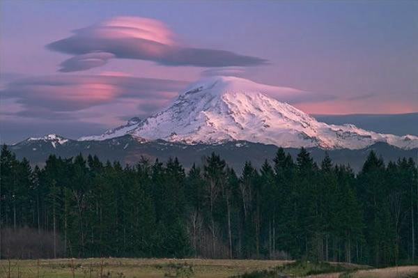 华盛顿州雷尼尔山上空的被染成淡粉色的荚状云