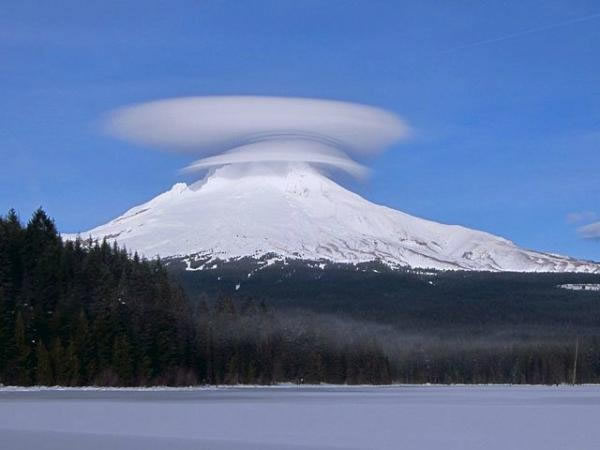 这张照片中的荚状云非常明显,荚状云通常会形成两层甚至更多层,而这种倾向和云层光滑、平坦的外貌意味着它们经常被比作一摞薄煎饼。值得注意的是荚状云主要的学名是荚状高积云,这个名字引用的是它们的外观。这些云彩更通俗的叫法是荚状云。而且当一串荚状云出现的时候,每一个云层都会爬上之前云层的顶部,这样就会产生一种著名的景观“波状云”。