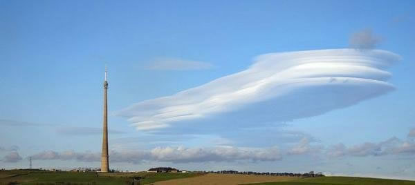 平原上空天蓝色的天空和不可思议的云层让这张照片成为一幅特别的作品。即使是西约克郡的Emley Moor发射塔也够不到这片荚状云奇观,这座塔是英国最高的独立式建筑,达到了330米的高度。