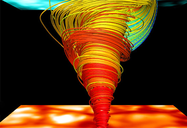 图片所示为对将所观测的太阳表面与外层大气连接起来的一个涡流磁性“龙卷风”所做的一个电脑模拟结果(利用CO5BOLD来进行)进行的虚拟化(利用VAPOR软件来进行)。
