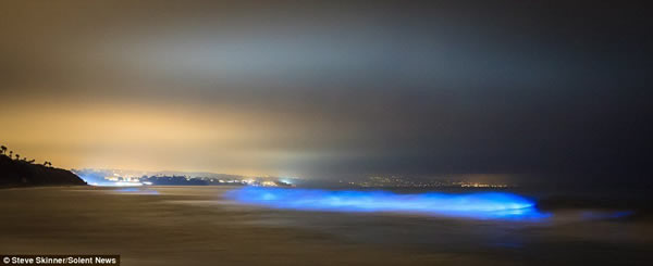 在午夜的时候四周都是黑暗的,但是这个著名的冲浪海滩上海浪的每一次碰撞都会产生怪异的蓝色闪光,这都被一位已经准备好用摄像机拍摄这种怪异现象的摄影师拍了下来。史蒂夫-斯金纳特意为了这种景色而来带这个海滩,这种景色是由水中的藻类导致的。当海浪碰撞的时候会导致藻类发出一种蓝色闪光,这种现象被称为生物性发光,就好像成千上万的生物体受到了打扰。