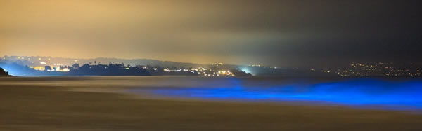 当海浪碰撞的时候会导致藻类发出一种蓝色闪光,这种现象被称为生物性发光。