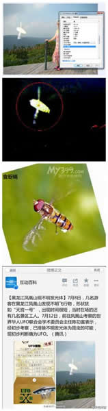 东北网7月14日讯昨天,知名科普网站果壳网就“凤凰山拍照惊现UFO?”发布微博:通过哈报提供的照片原图,果壳网频道主编Steed根据图片EXIF信息透露,拍摄者开了闪光灯。果壳网友“泛用人形决战兵器”通过技术处理,抠出了“UFO”的轮廓,大家认为,照片上显示的“UFO”可能是食蚜蝇。在果壳网,Steed通过本报提供的照片提供了一组其保留的原始exif信息,显示“快门速度500分之一秒,闪光灯开”,他认为是一只在按下快门的瞬间从镜头前一晃而过的蜜蜂。