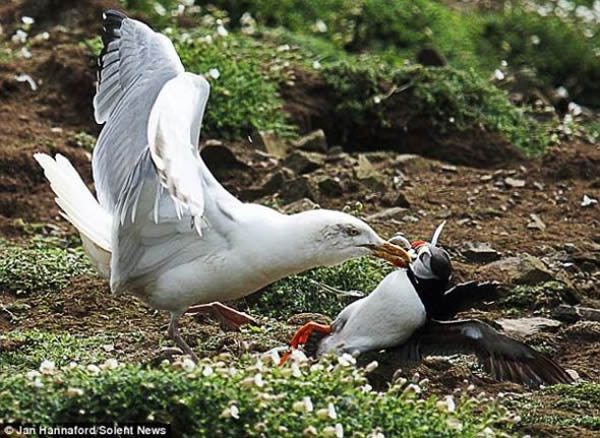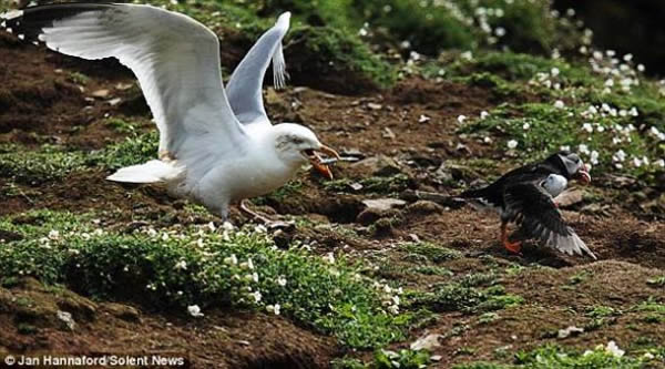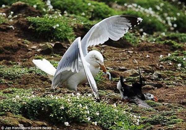这只海雀从海中捕到一条鳗鱼,上岸走向巢穴时遭到这只体型比自己大的海鸥的拦路抢劫