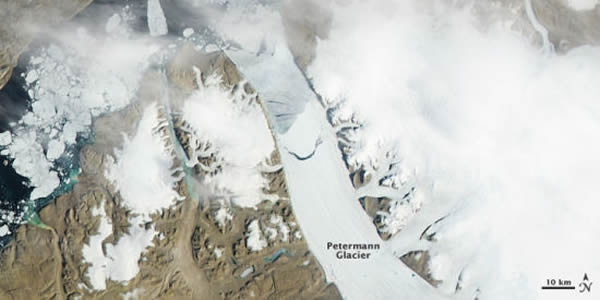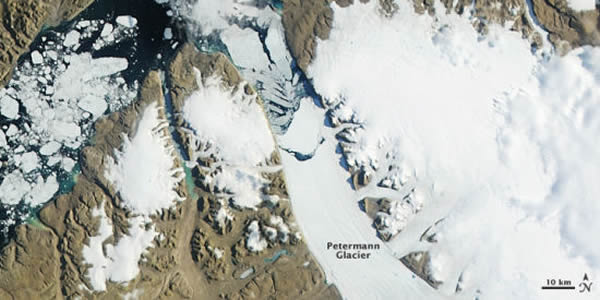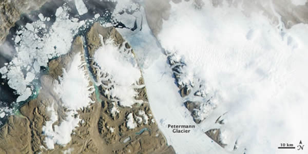 2010年,彼得曼冰川曾分裂出一个巨大的冰山,成为近五十年来北极地区最重大的一次裂冰。2012年6月,彼得曼冰川又一次裂冰。美国宇航局Aqua卫星上的中分辨率成像光谱仪(MODIS)于2012年7月16和17日拍下了上面这一组照片,显示了彼得曼冰川最近的这次裂冰过程。