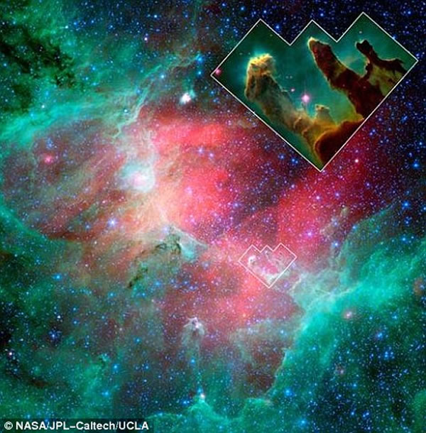 这张名为“三大创生之柱”(three Pillars of Creation)的照片是由美国宇航局的哈勃太空望远镜在1995年拍摄的,显示的是天鹰座星云中形成恒星的区域,成为20世纪天文摄影的经典之作。一直以来,专家们都不能确定“创生之柱”天文现象是如何形成的。