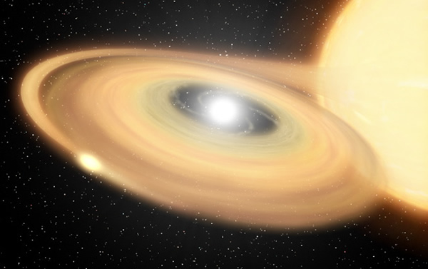 一项新的研究指出,包围在白矮星(拥有等于或大于太阳的质量的老年恒星,坍塌时相当于一个行星的大小)附近的令人难以置信的强磁场能产生不同寻常的化学键类型。由于包围在白矮星(图中的一个小恒星为艺术家构想的鹿豹座Z型星Z Camelopardalis)周围的磁场可能是地球磁场的成千上万倍,因此它实际上能扭曲围绕原子的电子云的形状。科学家们估计,这将会使化学键变得更短、更强,从而使分子被困在一个近似于原来25%的磁场空间内。