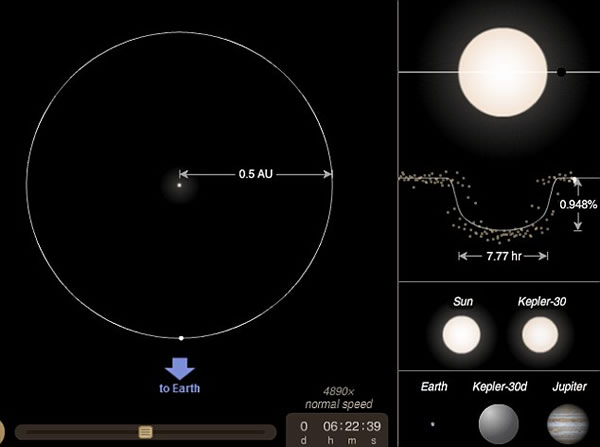 Kepler-30恒星系统中主恒星处于磁力活跃状态,表面覆盖着恒星黑子——恒星表面存在着较暗、温度较差的区域。德明教授说:“像太阳系一样,Kepler-30恒星系统中的行星很明显起源于一个旋转气体盘结构。事实上一些行星轨道完美地排列在恒星赤道平面上,然而一些行星却与恒星赤道平面排列不一致,这将使我们能够更多地研究分析行星轨道进化的形成。”
