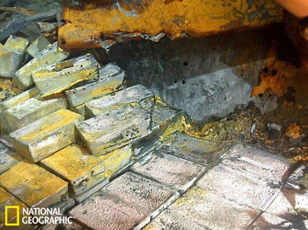 “海底工人”号的工作人员正在检查从“盖尔索帕”号上打捞出的银砖。奥德赛海洋勘探公司称,目前打捞起来的银砖被存放在英国。在1941年,“盖尔索帕”号从中弹到沉没经历了20分钟,但是从沉船中打捞出240吨银砖却需要几个月的时间,整个打捞工作可能在十月份完成。