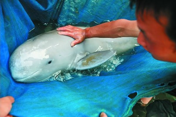 记者赶到现场时,这只动物的身边已经围满了人,大家正自发地进行救助,有的从自家拿来渔网将这只动物放在渔网中,有的则帮忙抬着渔网准备将它抬到水中。后经海洋部门证实这是一只江豚。这只江豚通体呈灰白色,体长约150厘米,50多公斤重。经检查,江豚身上没有外伤。