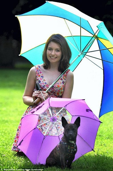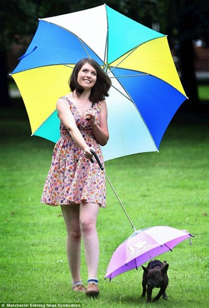 为了不让爱犬在散步时淋雨,英国曼彻斯特的一名宠物主人给她的小狗打起了特制雨伞