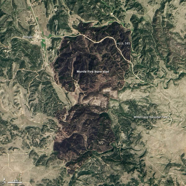 在南达科他州2012年的野火火灾中,对消防队员最具挑战性的一场大火发生在普林格尔镇西部的默特尔地区(Myrtle)。7月19日至24日,默特尔大火烧焦了超过10080亩黄松森林。上面的这幅照片是美国宇航局地球观测卫星1号(EO-1)卫星上的先进陆地成像仪(ALI)于2012年7月28日拍下的,显示了默特尔森林大火后的景象。