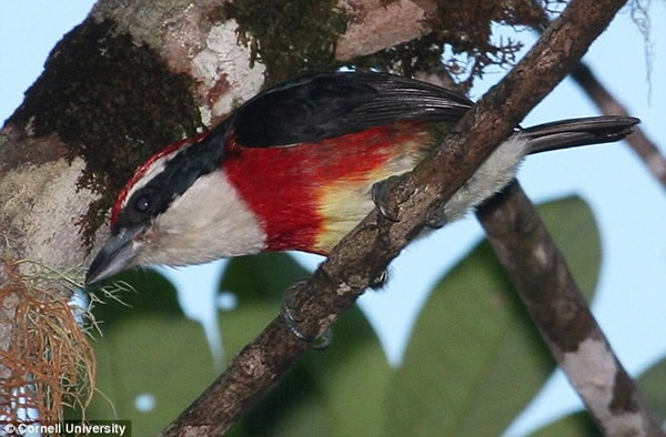 该鸟类新种被命名为“Sira Barbet”,学名为“Capito fitzpatricki”。该鸟类的面部为黑色,腹部呈灰白色,胸部是鲜红色。