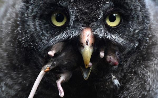 柏林动物园,一只幼年灰枭捕捉到了一只老鼠。