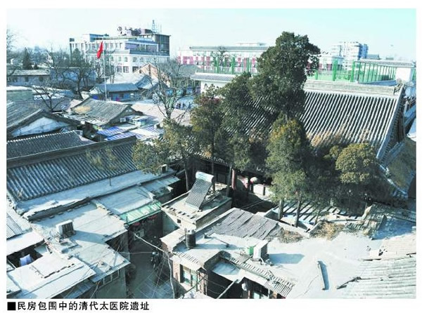 如今,狭小杂乱的院子很难让人将其与当年赫赫有名的清代太医院联系在一起。据记者了解,清代太医院的“办公”大堂已经不存在了,现在地安门东大街111号的商场原为太医院东院大门所在地,商场后面的民居是昔日的药房。另外,地安门东大街117号是太医院西院所在地,原来气派的“金柱大门”尚在,但大量的杂物堆放在门前,院内也建满了民居。