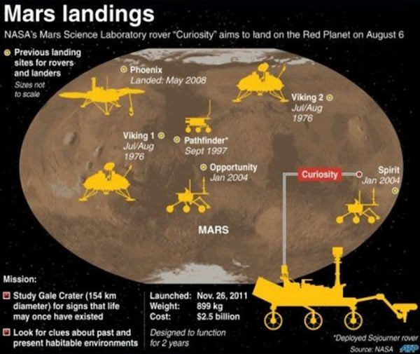 值得注意的是,在过去全球空间机构发射的火星探测器中只有40%的成功了。对此,火星科学实验室的首席飞行主任在喷气推进实验室认为我们的团队取得了令人惊异的成绩。好奇号火星车的任务小组在帕萨迪纳的喷气推进实验室进行全部的数据处理工作,火星车着陆的地点为盖尔撞击坑,其中有一座被称为夏普山的隆起,科学家们希望火星车能在这里发现具有10亿年历史的沉积层。