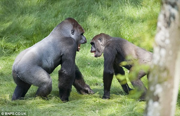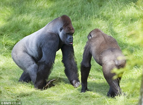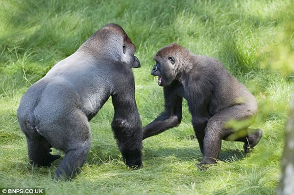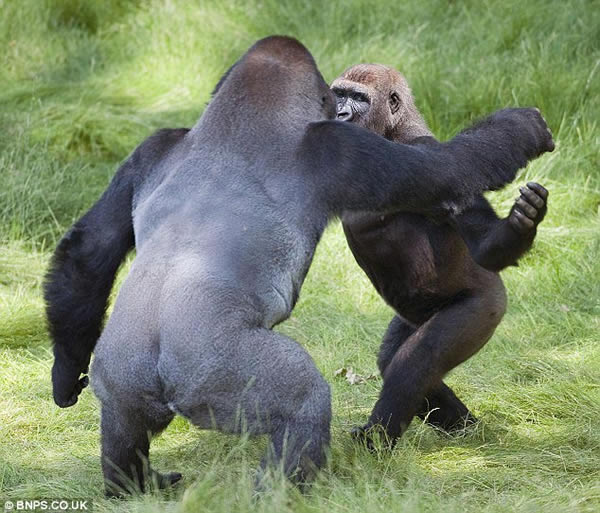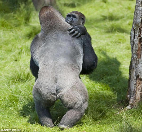 它们大力拥抱、握手勾肩,用这些亲昵的举动打破了久别重逢后交流的坚冰。在这三年中,Kesho已经从一只小黑猩猩成长为高大的银背大猩猩。可是这并未阻止Alf顺利地认出它的哥哥。