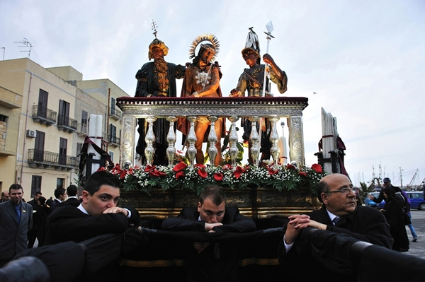 安德里亚-古雅尔奈里:在意大利特拉帕尼市举行的名为“iMisterii”的复活节神圣庆典中,这些信徒整夜扛着耶稣受难的舞台布景,只有在白天才能停下来休息。