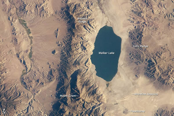 拉洪坦湖的残迹湖中只有两个湖终年有水——内华达州的沃克湖和皮拉米德湖(Pyramid Lake)。上面的这幅照片是国际空间站上的宇航员于2012年7月29日拍下的,突出的显示了沃克湖的景象。沃克湖座落在一个封闭的盆地中,东部和西部分别以Wassuk山脉和Gillis山脉为界。沃克湖由北边的沃克河供水。沃克湖目前长约21公里,宽约9公里。