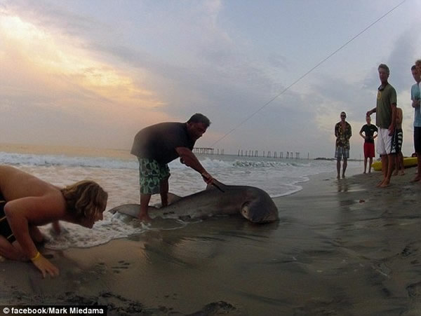 据英国《每日邮报》8月21日报道,美国马里兰州大洋城(Ocean City)的一位渔民近日在海上钓到一头7英尺(约2.1米)长的沙虎鲨,并将这个大家伙拖上岸边,随后在对其进行拍照证明他当天的收获后,将这头鲨鱼放归大海。