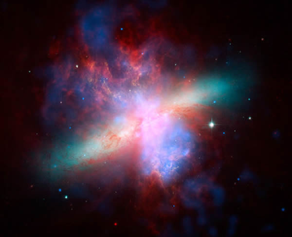 这是M82,一个星爆星系,所谓星爆星系就是指正有大量恒星正在形成的星系。在这张多波段合成图像上,我们可以看到物质流正在从星系内部喷出