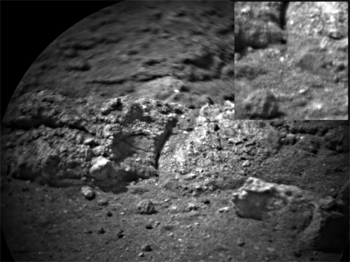 据科学家介绍,“好奇”号火星车上的推进器首先会将火星表面的岩石暴露出来,然后化学分析相机上的远程微缩成像设备会对被称为“古尔本”的岩石进行拍摄。图片显示了这个插入点在不同亮度下的差异以及阴影的轻微变化。插入物所占的区域面积约为1平方英寸(约合6.5平方厘米),目标距离火星车大约5.8米。