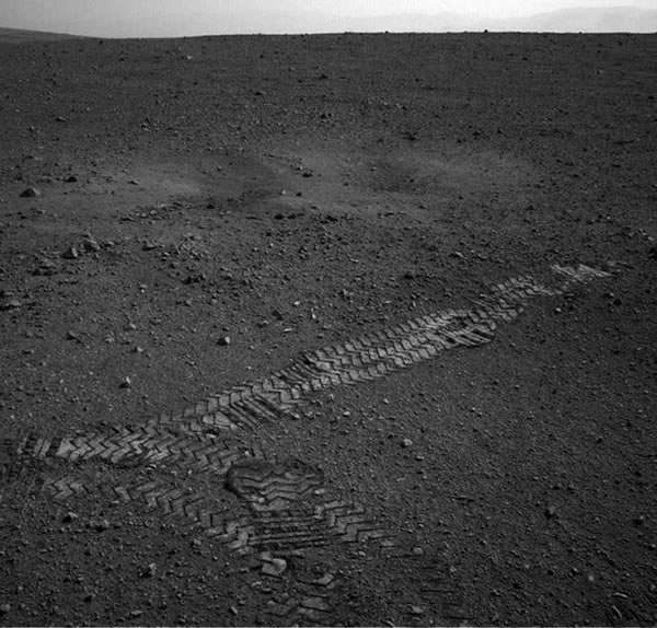 美国宇航局最新公布的360度全景图像显示了好奇号火星车首次测试行驶的成功记录,在图像中可清晰地看到该火星车的轨迹。在行驶开始的位置可看到一块9厘米大小的岩石,工程师称在着陆时这块岩石位于后车轮下面。