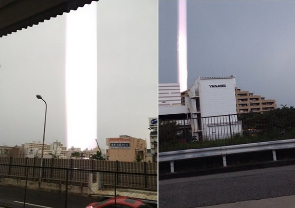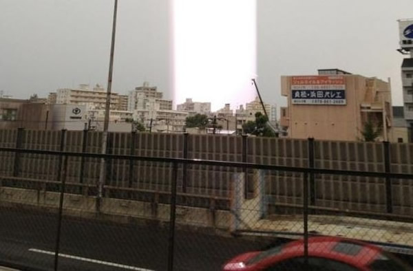 历经两个月高温,日本下起雷雨,极端天气让日本民众唉唉叫,不过就在8月18日一场大雷雨过后,网络出现了诡异的照片──笔直的大光束从天空延伸到 地面,由于太过诡异,网友议论纷纷,有人说该不会是外星人降临地球了吧?不过仔细看看这光束,似乎暗藏玄机,瞧瞧它又白又宽,线条直得诡异,彷彿是画出来 的,有可能就是网友用photoshop修出来的。