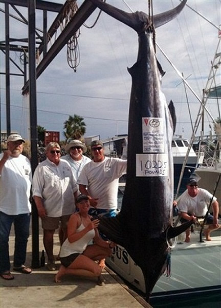 日前在美国夏威夷举行的钓鱼比赛中,一位美国女子捕获一条近半吨重的马林鱼。