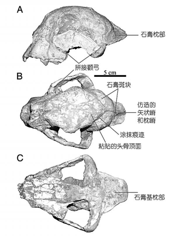 “柯氏猎豹”头骨上造假部分的标注。(邓涛提供)