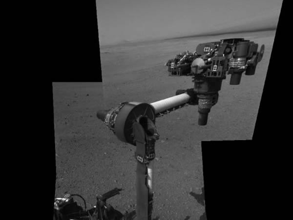 好奇号首次机械臂伸展实验:这张图像由好奇号上的导航相机拍摄,展示了伸展开的机械臂,时间是8月20日。这条2.1米长的机械臂上搭载了许多复杂设备,包括相机,钻头,分光计,一个小勺子,以及用于样本筛选和分配的机械装置。