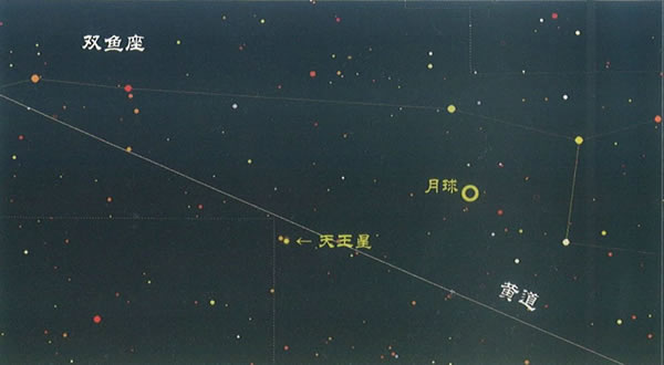 9月29日天王星冲日,它位干双鱼座天区内,亮度为5.7等。与智神星在前后两天冲日,并不意味着它们的角距离很近,因为天王星更靠近黄道。相比之下,29日晚它与满月倒是靠得很近,当然这也为我们拍摄天王星增加了难度。而找到天王星则必须借助Skymap这类电子星图,希望下面的示意图也能为大家提供一些帮助。