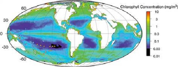 卫星测量的海洋营养含量图,在南太平洋区域有一个巨大的区域并不存在营养成分