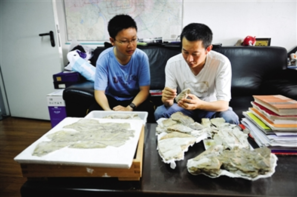 余逸伦(左)在中科院古脊椎动物与古人类研究所向徐星(右)请教问题,桌上放着他们这次野外考察发现的恐龙化石。