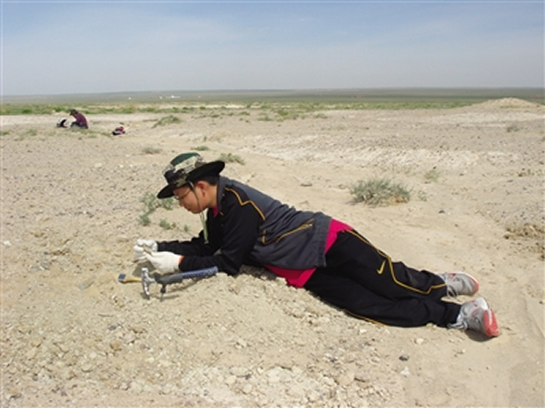 在8天的野外考察里,余逸伦每天早上8点就和大家一起出发,到达恐龙化石点,然后拿着地质锤和小刷子,一点点搜寻恐龙印迹。因为这个化石点在上个世纪50年代被苏联科学家用推土机“推”过,留下很多化石碎片,寻找过程繁琐而艰苦,“很考验耐心。”