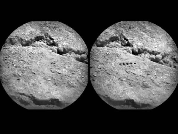 这张照片中的孔洞宽度约0.08英寸(0.2厘米),长度为0.16英寸(0.4厘米),这远远大于激光烧蚀孔洞的大小,其直径大约仅有0.43毫米。这一案例展示了激光用于烧蚀并蒸发尘土颗粒以及微细的未固结颗粒的强大能力。之前使用分光计获取的光谱数据中,对于这5个点的位置上的成分分析结果显示其基本都是相同的,但是使用点激光技术之后,这5个点在化学成分上的微细差异就显现了出来,足见这种方法的分辨率之高。