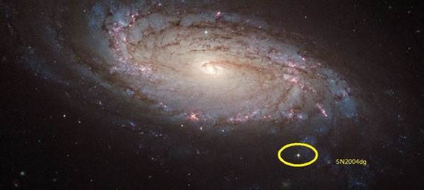 SN 2004dg 超新星爆发被认为是一场突如其来的天体事件,意味着一颗巨型恒星生命周期的结束,在图中星系悬臂外围靠近底部的淡黄色点就是这颗超新星爆发发出的光亮。在天文学家眼中,NGC 5806是被选择用于观测超新星爆发的数个星系之一,在哈勃空间望远镜的数据库中,已经包含了这个星系不同时期的高分辨率图像,收集到超新星爆发前的星系景象。由于超新星爆发是宇宙中出现的频率较低,而且无法准备预测,因此天文学家们一般采用照片叠加法进行判断,通过将目标星系不同时期的照片重叠来发现这些宇宙中的“极端事件”。