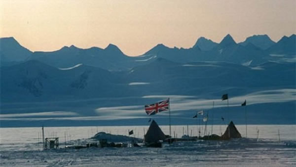 英国国旗在埃尔斯沃思湖的野外营地上空飘扬,照片背景是南极洲最高的山脉埃尔斯沃思山