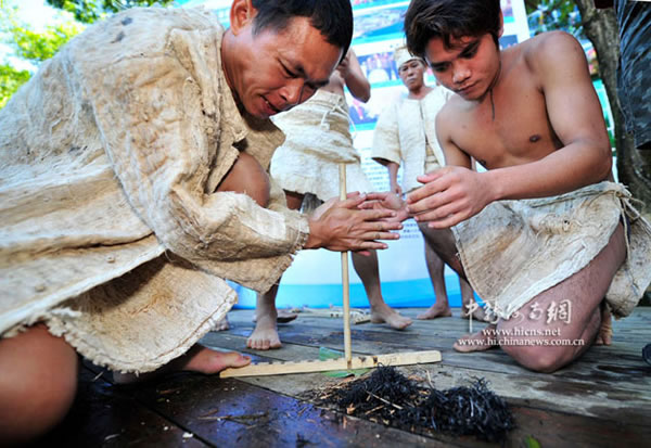 9日上午,在海南五指山市举行的首届海南少数民族生态文化节上,几位黎族男子身着用“见血封喉”树皮制作而成的树皮衣,在现场演示了传统的钻木取火技艺。