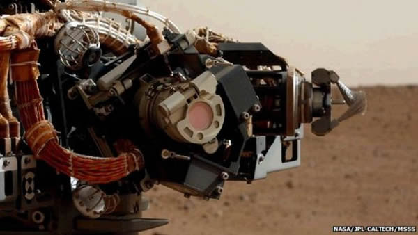 这幅机械臂顶端的工具转台照片是由“好奇”号装载的广角照相机拍摄的。图中右侧毛刷的作用是用来扫除岩石样本上的灰尘。