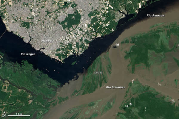 2012年6月17日,NASA的地球观测卫星1号(EO-1)上的先进陆地成像仪于拍下了这幅照片。当卫星拍摄这幅照片时,Meeting of the Waters的水位达到了至少一个世纪以来的最高点。2012年上半年,马瑙斯市遭受了创纪录的洪水。