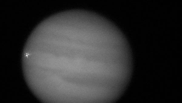 这是霍尔拍摄的录像截屏,可以清晰的看到木星左侧出现了一次明显的闪光,这可能是一次撞击事件